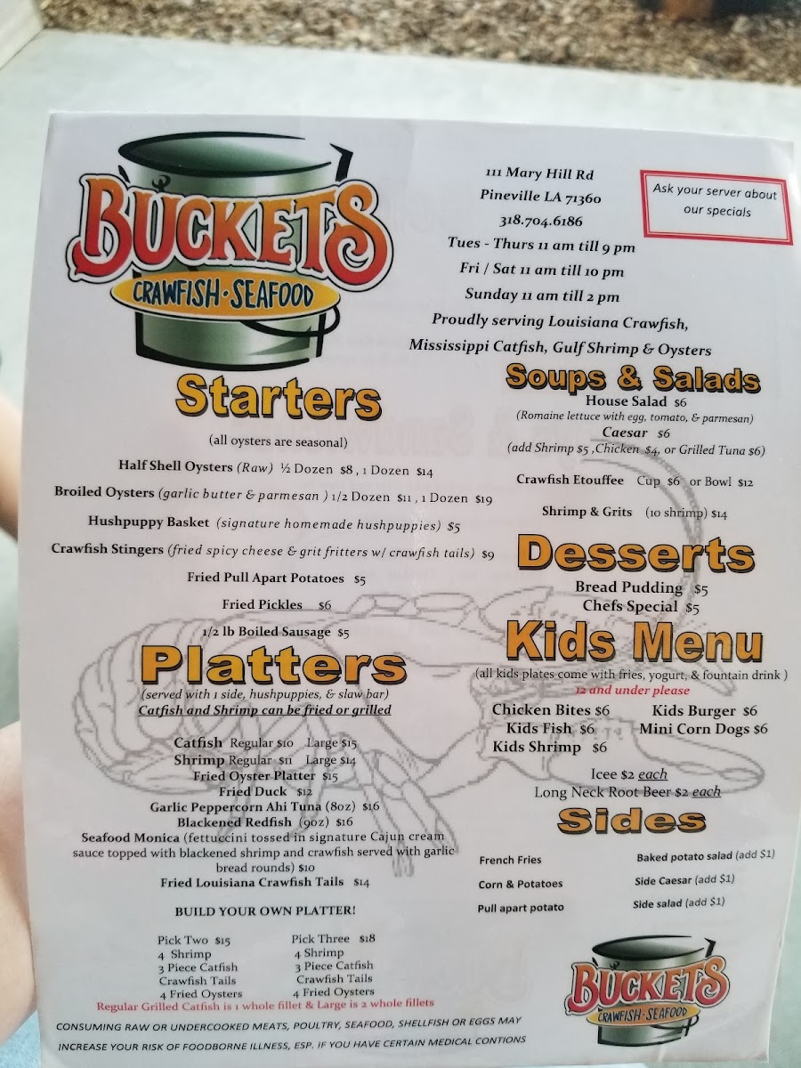 Welcome to Buckets Crawfish and Seafood, located at 111 Maryhill Rd, Pineville, LA, a treasure trove for seafood lovers in search of authentic Southern flavors.